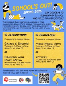 Through the generous support of the United Way British Columbia and in partnership with the Roberts Creek Community School Association, and community schools across the coast, we are able to offer the School’s Out and Future Leaders programs.