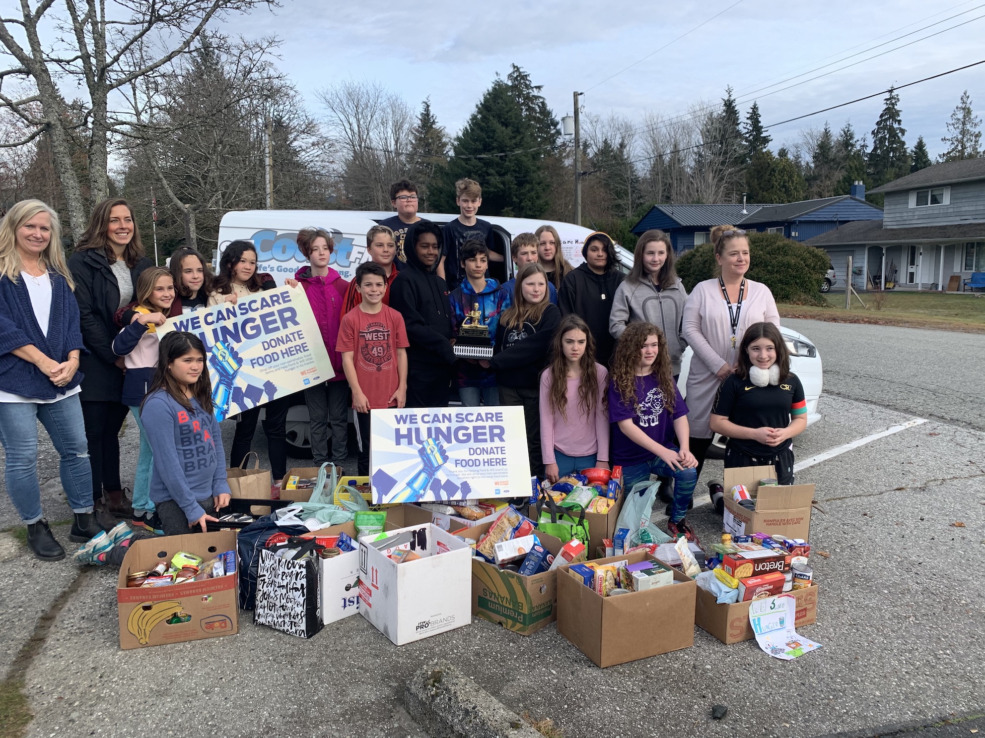 Teacher Kassandra Stinchcombe and her Division 2 Halfmoon Bay class spearheaded and teamed with Ford to start a Sunshine Coast competition to raise money and food for our local food bank. It’s inspired by the Me-2-We organization and was named “First Annual We Scare Hunger Sunshine Coast Competition”. The goal is to not only raise money for our local food bank, which is being used much more than it used to be. But also to encourage empathy, confidence, purpose, service work, and leadership skills in our youth. Several schools participated, and together we raised 4062 units for our local food bank. 1 non-perishable items = 1 unit, and $1 =1 unit. Two students from Kassandra’s Div 2 class did a radio broadcast with Louis from Ford. Schools also did a lot of other work, coming up with creative, meaningful ways to increase awareness and donations.