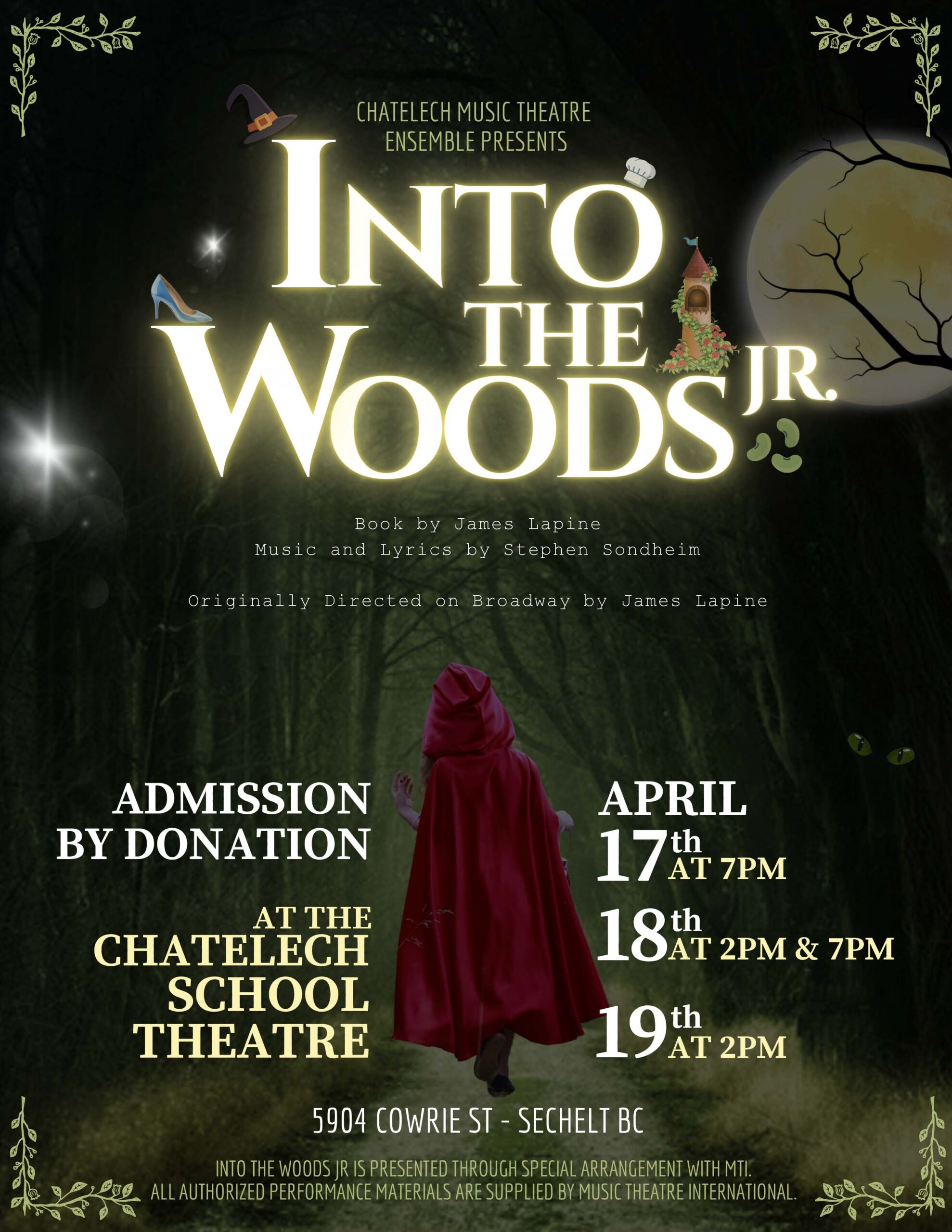 - Chatelech Music Theatre Ensemble Presents Into the Woods April 17th @ 7 pm, 18th @ 2 and 7 pm, and 19th at 2 pm – admission by donation