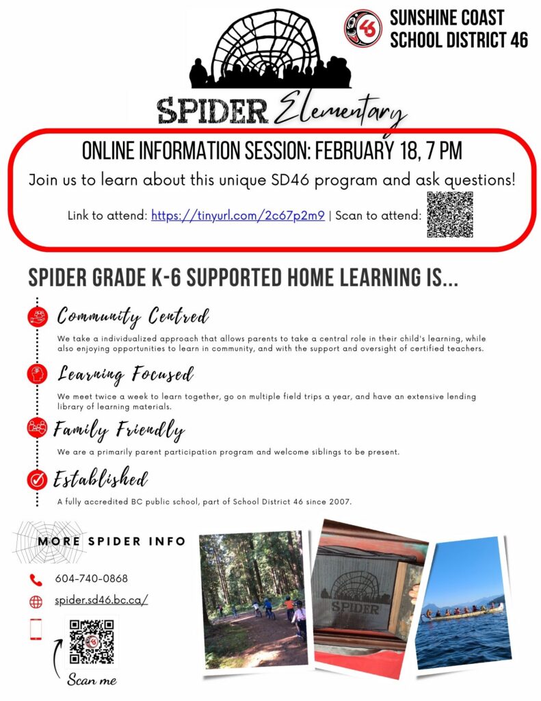 Join us for the SPIDER Elementary Online Information Session and learn more about this supported home learning program (Grades K–6) in SD46!